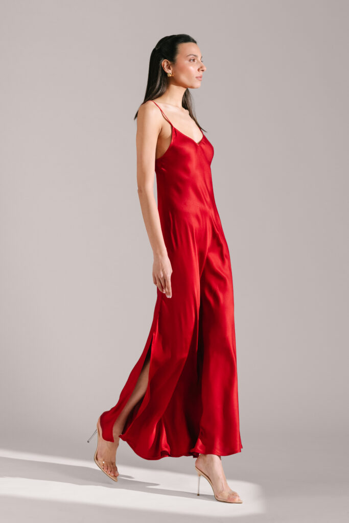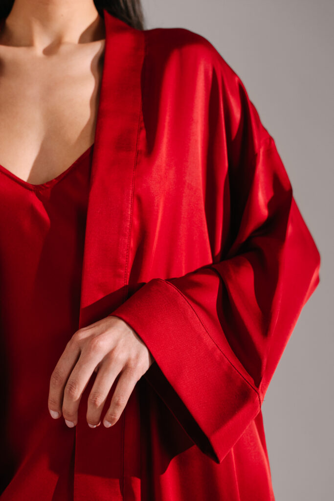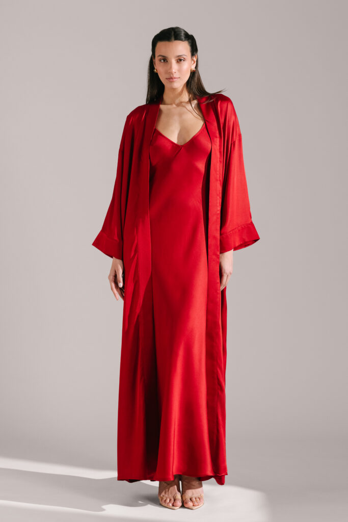 The Diana set combines a minimal slip dress with a relaxed robe.
